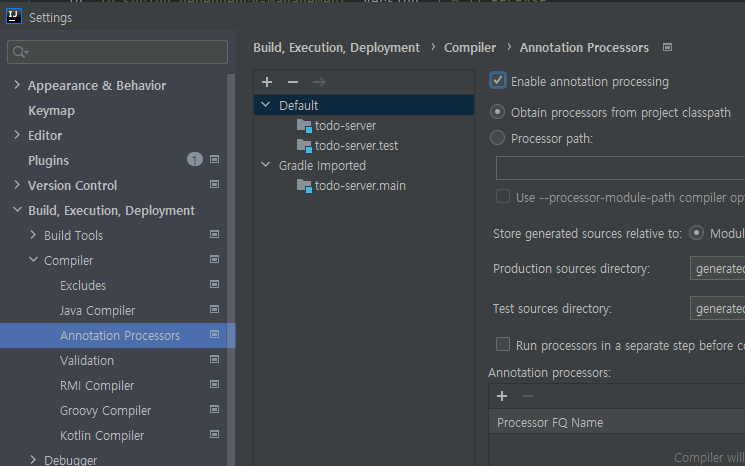 3. Settings - Build, Execution, Deployment - Compiler - Annotation Processors 들어가서 Enable annotation Processing 체크하기
