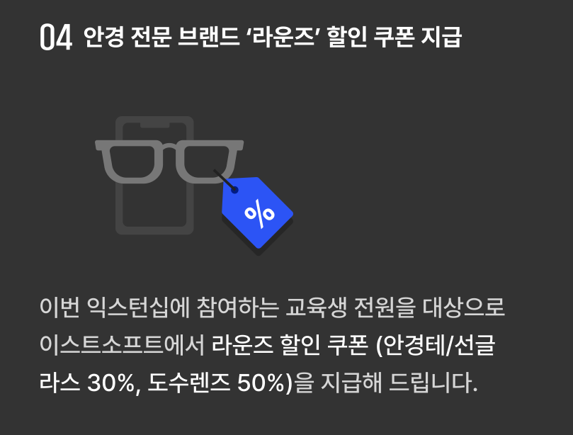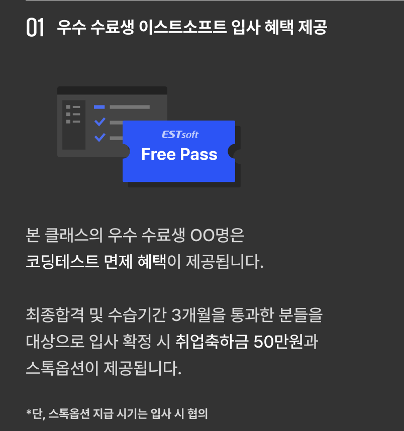 우수 수료생 00 명에게는 이스트 소프트 계열사 지원 시 코딩테스트가 면제 된다.