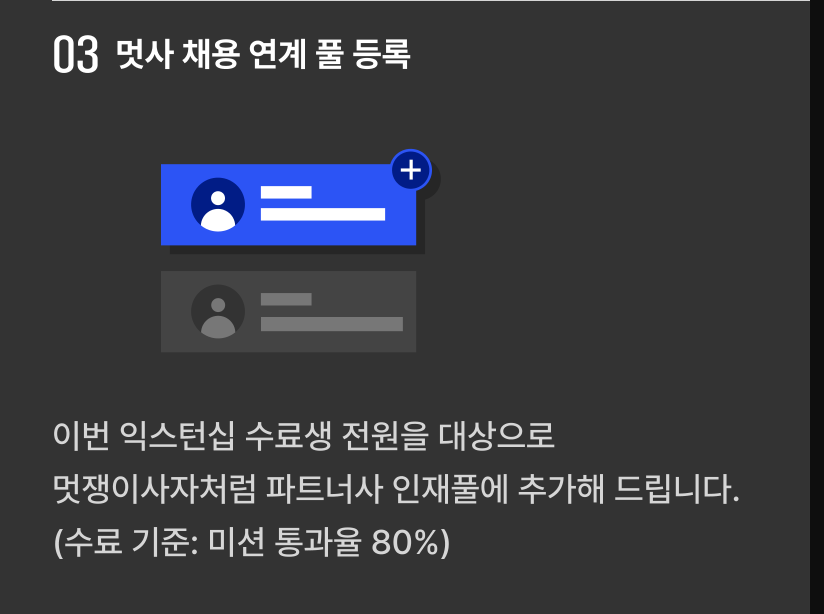 우수 수료생이 아니더라도 미션을 80% 통과하여 수료한다면 멋사 파트너사 인재풀에 추가 되기 때문에 취준생과 주니어 입장에서 앞으로의 커리어 패스에 좋은 혜택일수 밖에 없다.