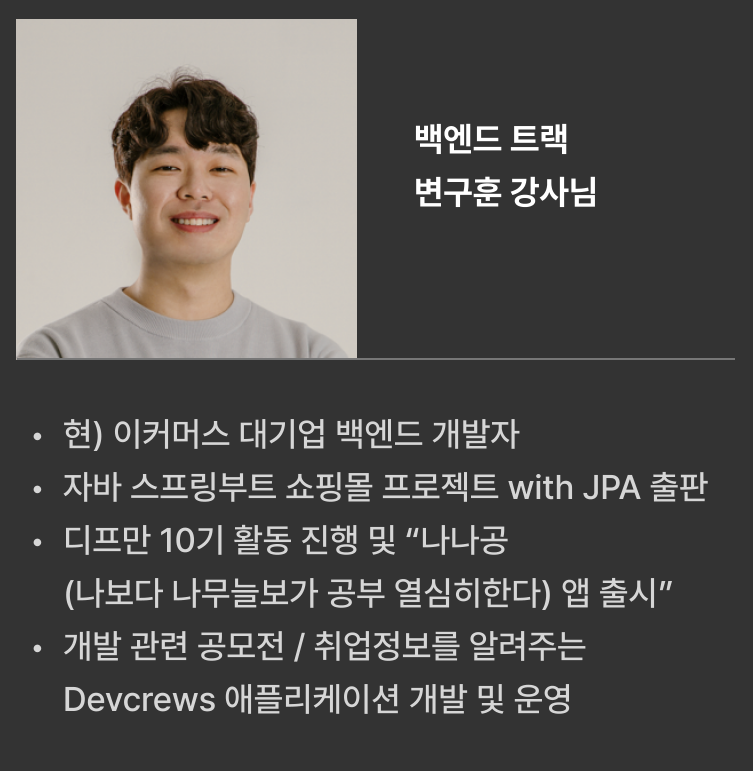 백엔드(자바 스프링부트) 단일 트랙으로 구성되어 현업 시니어 개발자 강사님과 함께 5주간 실전형 미션을 수행