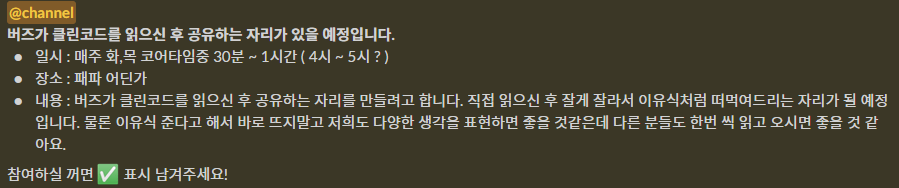 그리하여 네트워크 스터디는 중단했고, 주 2회 한시간씩 클린코드를 읽고 공유하는 자리를 한달 간 진행했다.