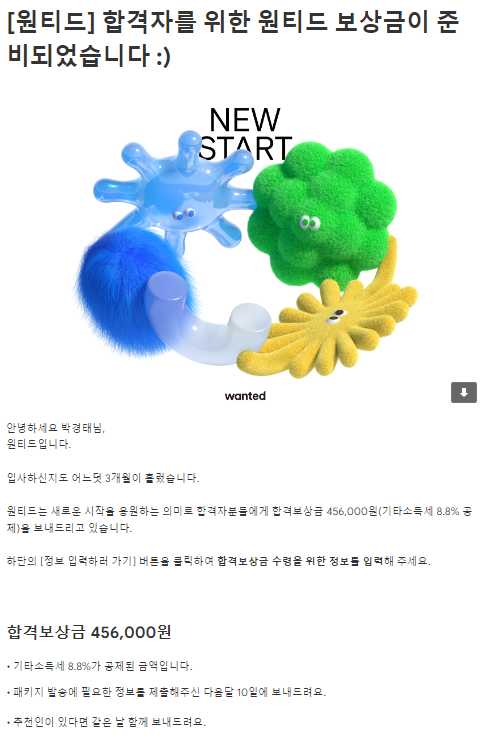 가벼운 이야기를 먼저 하자면 원티드에서 합격 보상금과 굿즈를 받게 된다.