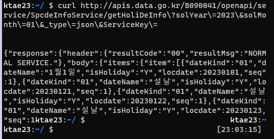 http://apis.data.go.kr/B090041/openapi/service/SpcdeInfoService/getHoliDeInfo?solYear=2023&solMonth=01&_type=json&ServiceKey=서비스키