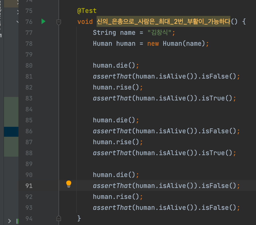 허술하고 딱히 이어지는 스토리가 있는것도 아니지만 앉은자리에서 1시간 정도 테스트 코드를 짜고 객체를 구현하며 해본 재밌는 학습 테스트였다.
