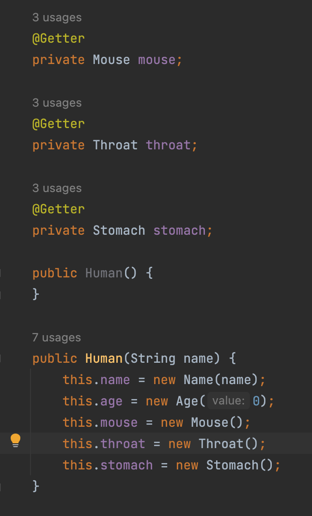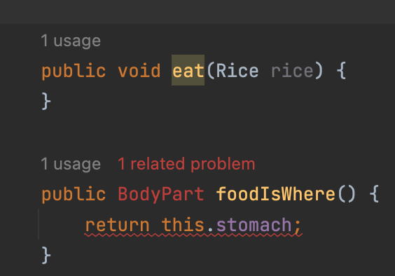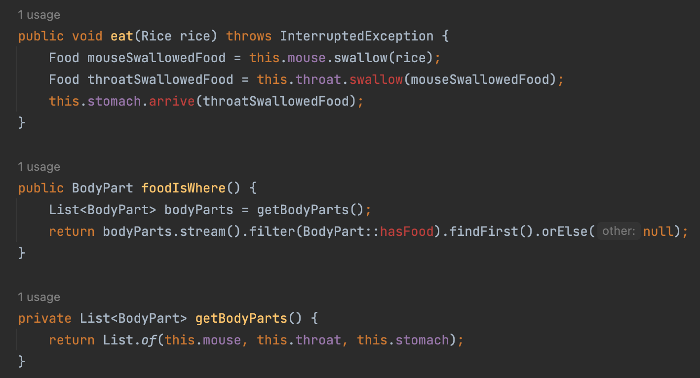 이후 BodyPart 인터페이스를 입, 목, 배가 구현하도록 하고 Rice는 Food 인터페이스를 구현하도록 한다.