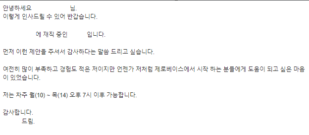 언젠가 나처럼 제로베이스로 시작하는 분들을 위한 도움을 주고 싶었기 때문에 눈이 커지고 입이 벌어지는 기쁜 메일이었다.