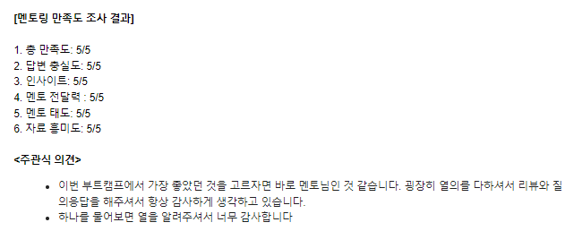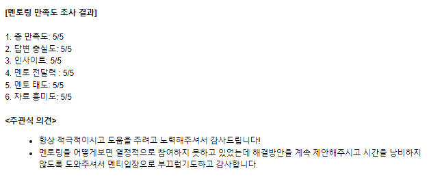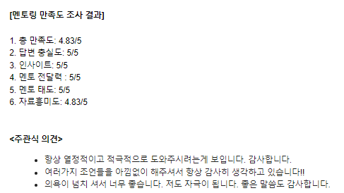멘토링을 하며 많은 대화를 나누고 즐거운 시간을 보냈지만, 멘토링을 하면서 가장 기쁘고 힘이 되었던 순간을 뽑으라면 월별 멘토링 만족도 조사 결과를 받았을 때가 아닐까 싶다.