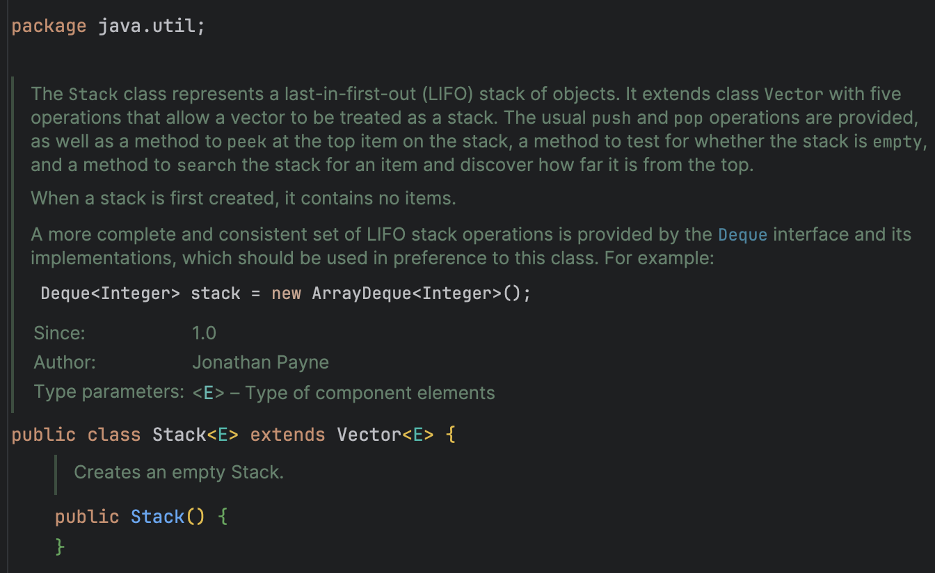 jdk21 기준으로 코드를 보고 있다지만, 찾아보니 이미 자바 1.6이 나온 2006년 말부터 Stack 대신 Deque를 쓰라고 권장하고 있었다.