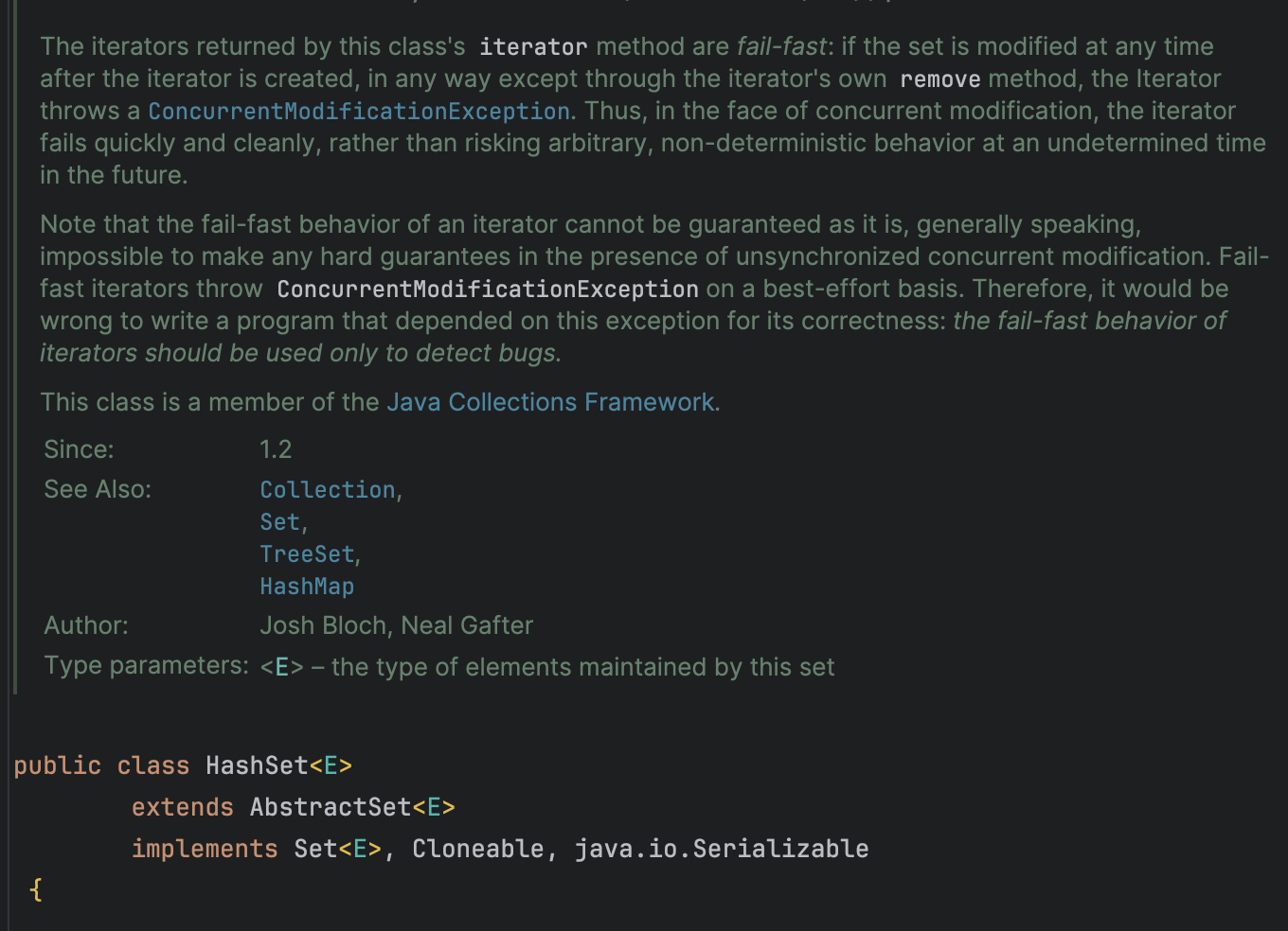 HashSet은 java.util 패키지에 위치하며 AbstractSet<E>를 확장하고 Set<E>와 Cloneable, Serializable을 구현한다.